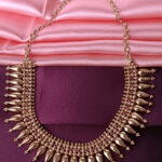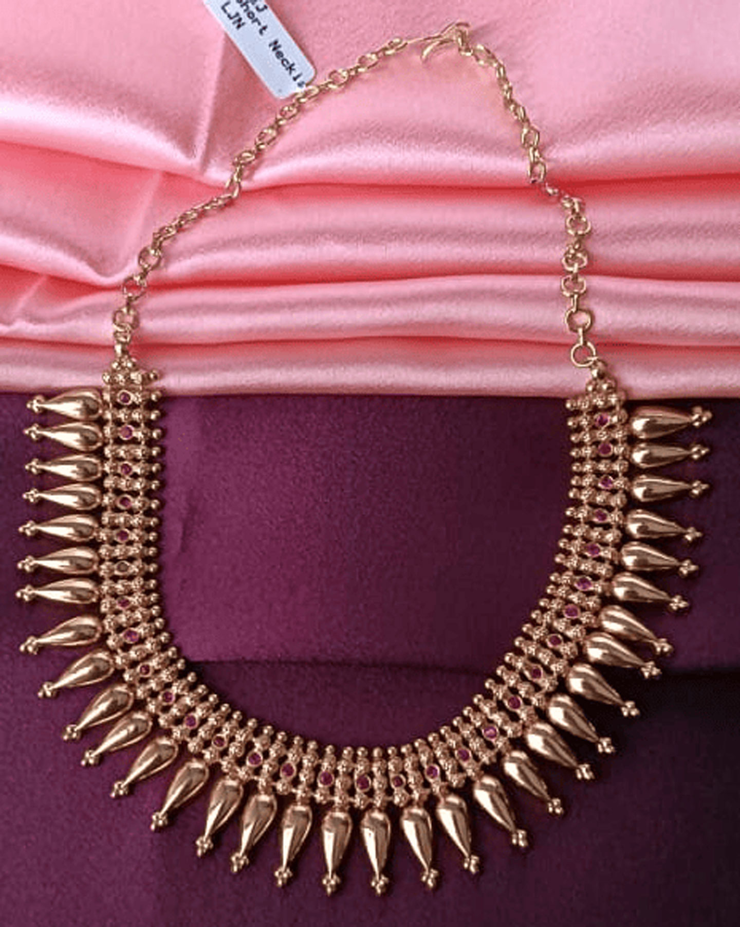 A broader gold necklace with larger teardrop elements ,creating a bold statement piece.features tiny pink stonesalong the inner band ,enhancing its luxurious appeal.